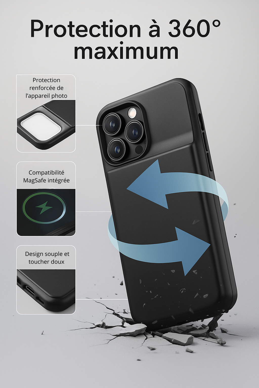 Avec une conception conçue pour 1000+ cycles de charge, cette coque assure une longue durée de vie de la batterie. Profitez d'une utilisation continue de votre iPhone sans vous soucier de la perte d'autonomie, offrant une expérience fiable et durable.
