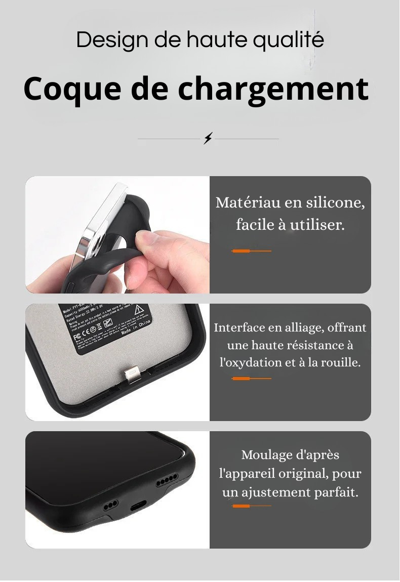 Avec une conception conçue pour 1000+ cycles de charge, cette coque assure une longue durée de vie de la batterie. Profitez d'une utilisation continue de votre iPhone sans vous soucier de la perte d'autonomie, offrant une expérience fiable et durable.